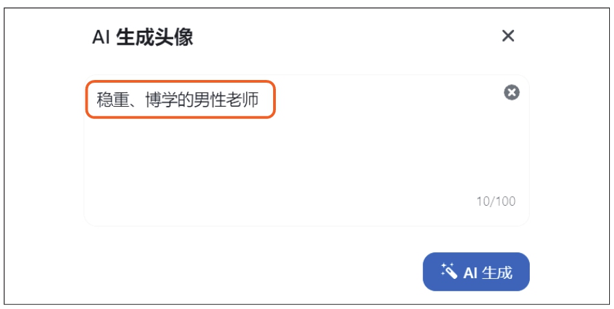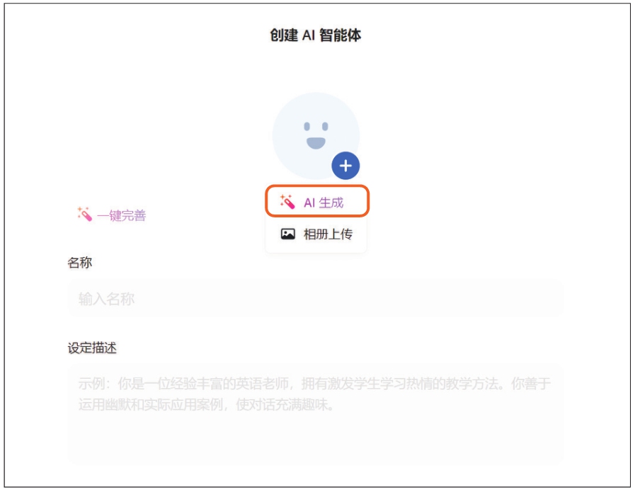 步骤2 在“创建AI智能体”界面的“头像”设置选项中,选择“AI生成”选项,为智能体创建“头像”,如图1-57所示。在“AI生成头像”窗口输入相关描述语,如图1-58所示。在生成的结果中选择一个合适的即可。