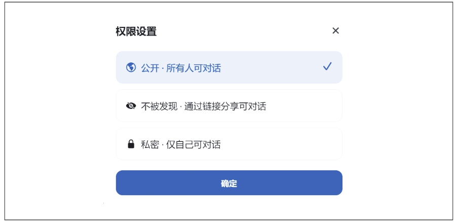 步骤5 在“权限设置”选项中可以设置该AI智能体的使用权限,包含公开、不被发现和私密,如图1-61所示。