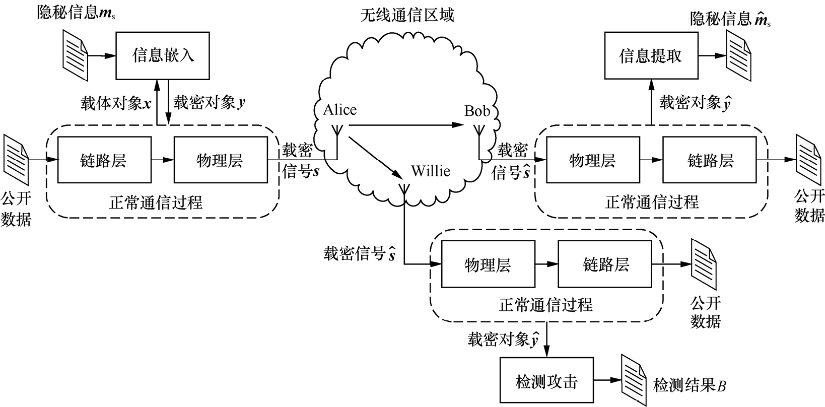 无线隐蔽通信信道的调制与检测是无线隐蔽通信领域关注的两个重要问题。前者的目标在于如何有效平衡通信速率、通信可靠性以及抗检测性,达到在不同应用场景(如多播场景和MIMO场景)对抗条件下的最佳综合性能。后者的目标在于如何在开放信道中有效侦测无线隐蔽通信行为的存在,具体来说,本质是利用幅值识别、相位识别、相关性识别和图像表征识别等特征识别技术,将载密无线信号与正常无线信号迅速、精准地区分开来,达到在不同的无线隐蔽通信场景下发现隐蔽通信活动的作用。