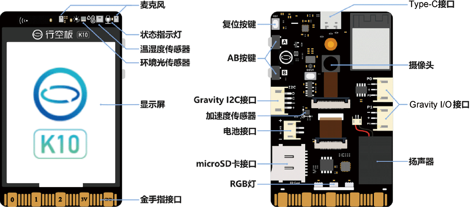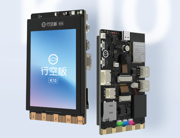 行空板K10是什么行空板K10是一款专为学习和体验人工智能而设计的开发学习板,100%采用国产芯片,知识产权自主可控,符合信息科技课程中编程学习物联网及人工智能等教学需求。行空板K10集成LCD(液晶显示)彩屏、Wi-Fi、蓝牙、摄像头、麦克风、扬声器、RGB(三原色,包括红色、绿色、蓝色3种颜色)指示灯、多种传感器及丰富的扩展接口。凭借高度集成的板载资源,教学过程中无须额外连接其他设备,便可轻松实现传感器控制、物联网应用以及人脸识别、语音识别、语音合成等人工智能项目。