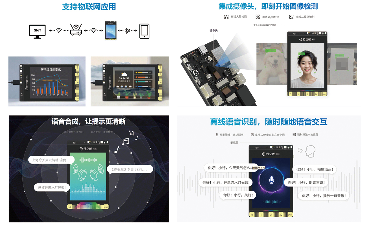行空板K10的应用行空板K10集成了多种传感器,并支持离线人脸检测、语音识别与合成等AI功能,如图1-4所示。借助这些强大的功能,我们可以迅速上手制作各种智能交互项目。例如,通过摄像头和AI算法,我们可以实现“人脸门禁系统”;利用语音模块,我们可以实现“语音控制灯光”;结合温湿度传感器,我们还可以设计制作出“环境监测器”等。这些功能不仅极大地简化了硬件连接与代码编写的过程,还能与图形化编程工具相结合,让中小学生也能轻松体验探索人工智能与跨学科创意融合的无限乐趣,充分激发学生在AI、编程与硬件交互方面的创造力。