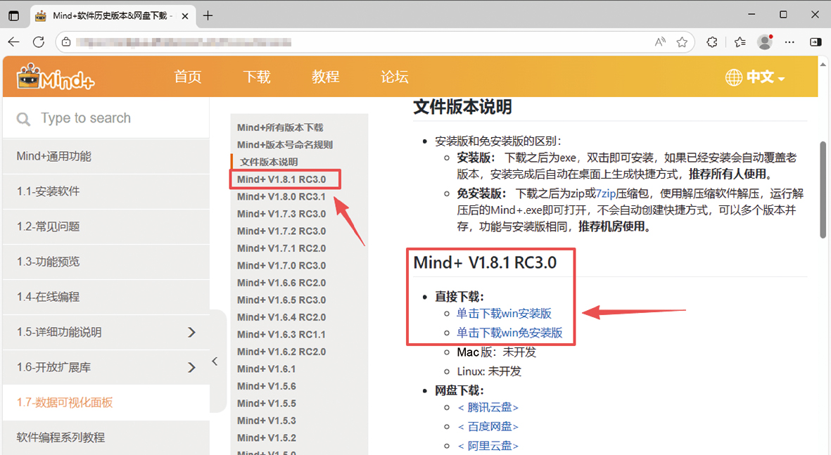 你也可以通过浏览器直接访问Mind+历史版本下载页面,在该页面中选择“Mind+V1.8.1 RC3.0”版本。该版本提供Windows安装版和Windows免安装版两种下载链接,可供用户根据自身的实际需求选择相应的版本进行下载,如图1-7所示。
