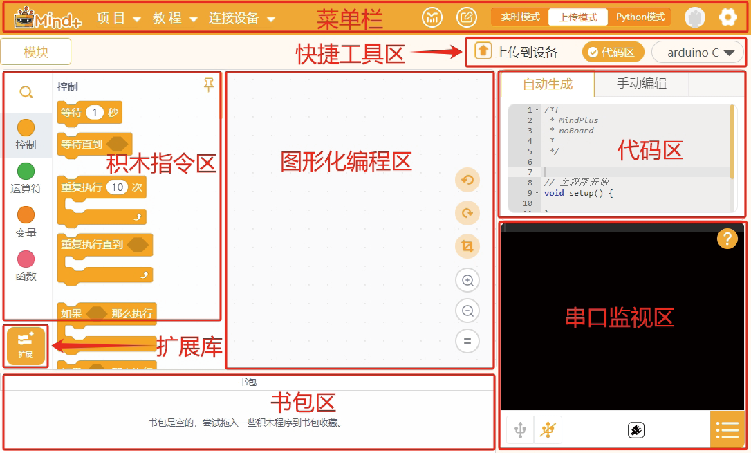 (2)快捷工具区:“上传到设备”是Mind+在上传模式下的核心功能,它用于将编写好的程序(无论是图形化积木指令生成的代码还是手动编辑的代码)编译并烧录到连接的硬件主控板(如Arduino、行空板、掌控板等),使硬件脱离计算机独立运行。代码区显示切换功能用于控制代码区和串口监视区的显示或隐藏。编程语言选择功能用于选择编程使用的语言。