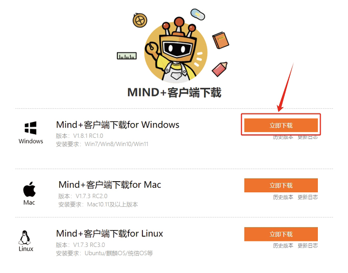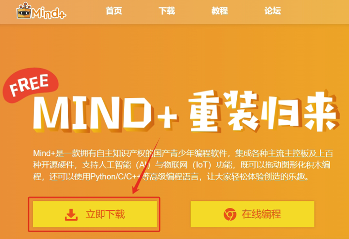 进入Mind+官网首页,如图1-5所示,单击“立即下载”按钮进入软件下载页,再单击“Mind+客户端下载for Windows”后面的“立即下载”按钮,如图1-6所示,这样软件就会下载保存在计算机相应的位置。