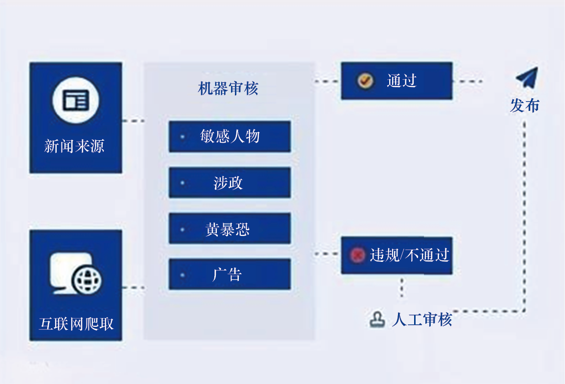 突破传统融媒体“多形式简单叠加”的模式,利用人工智能实现内容自动化生成(如AIGC新闻写作)、智能剪辑(如AI提取新闻片段)、跨模态转换(如文字转短视频),并基于用户行为数据实时优化内容结构。例如,由新华智云自主研发的国内首个媒体人工智能平台“媒体大脑”,将人工智能引入新闻内容生产全链路,实现采集、生产、审核、分发环节的智能化创新,帮助用户高效完成新闻创作。该平台可在5秒内生成赛事短视频,已应用于世界杯、亚运会和世界人工智能大会等重大活动。其智能审核流程如图1.8所示。