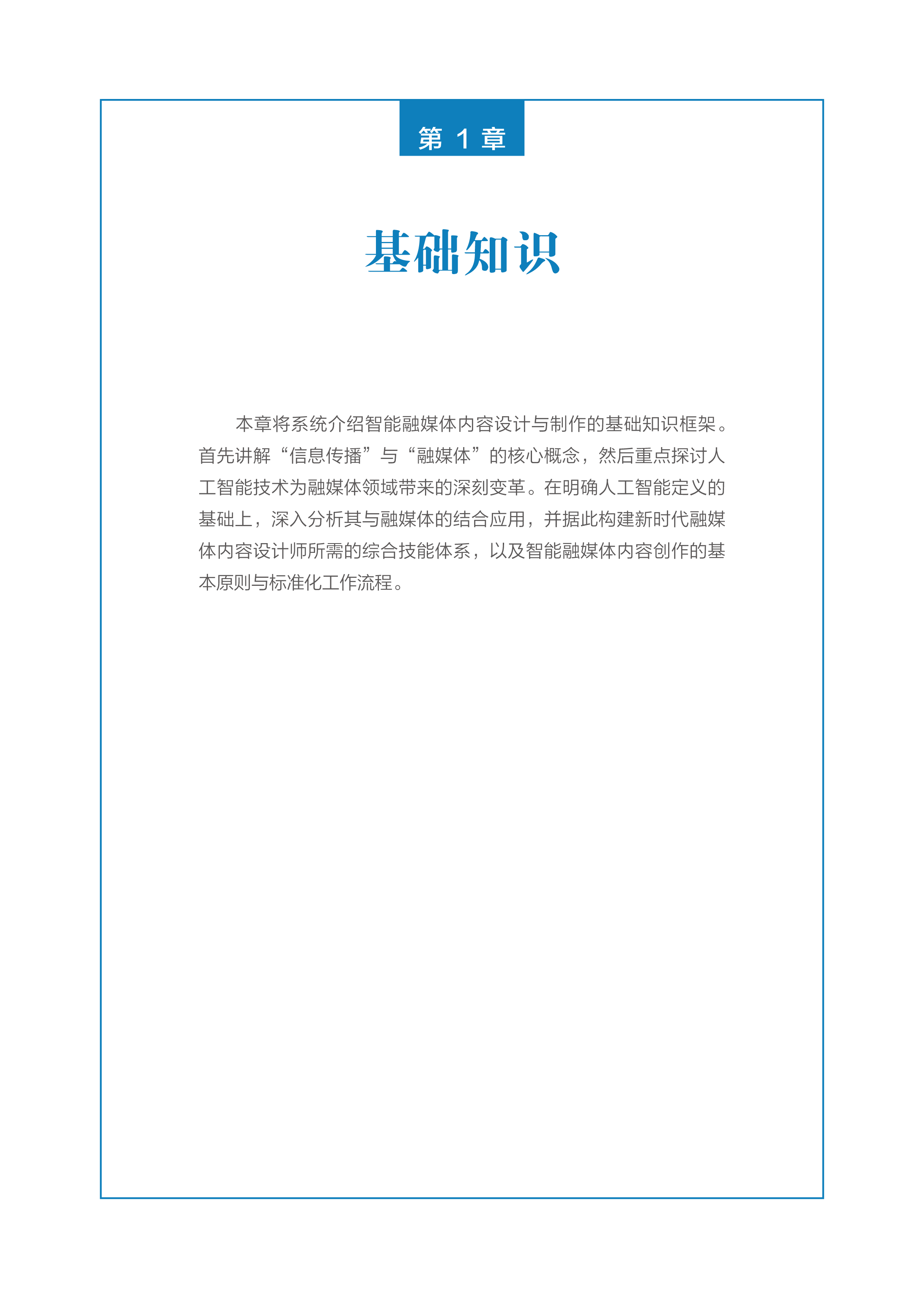第1章 基础知识信息是经过加工处理的有意义的内容。信息传播是将信息内容传递出去的过程。学习融媒体技术的目的是实现更有效、更便捷的信息传播。