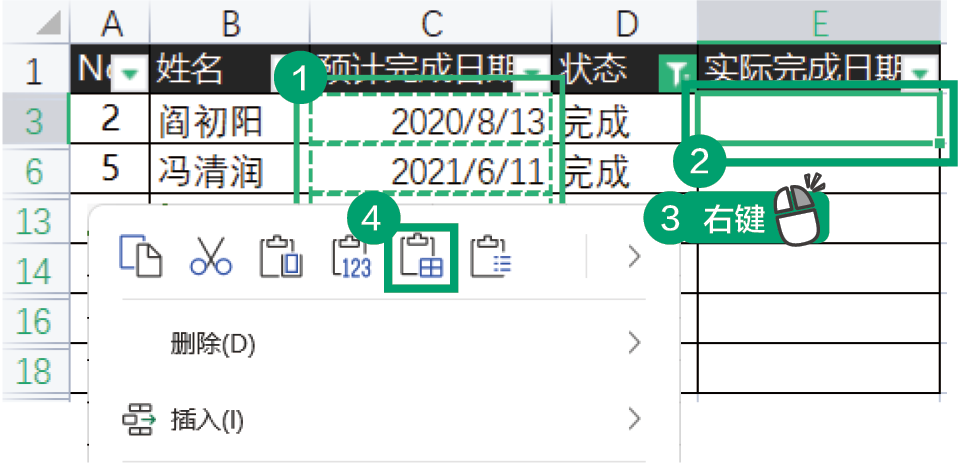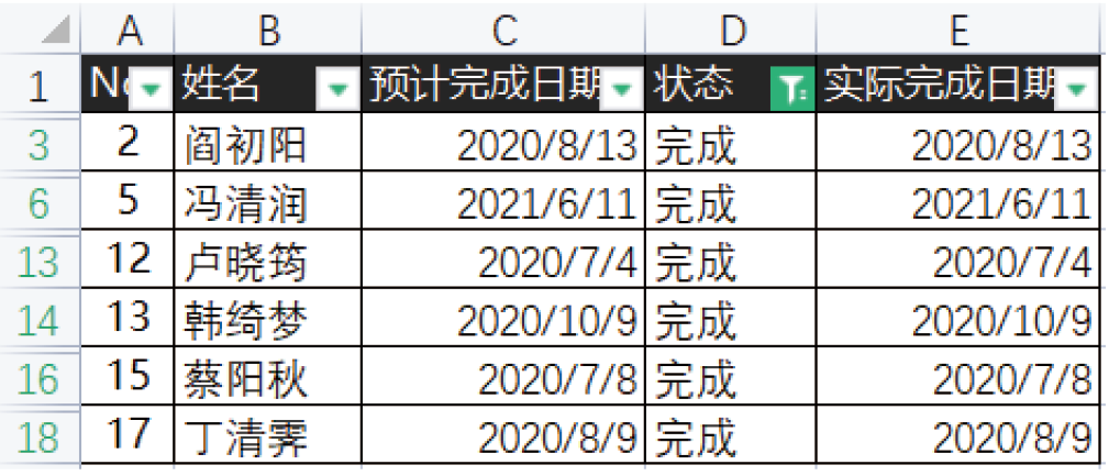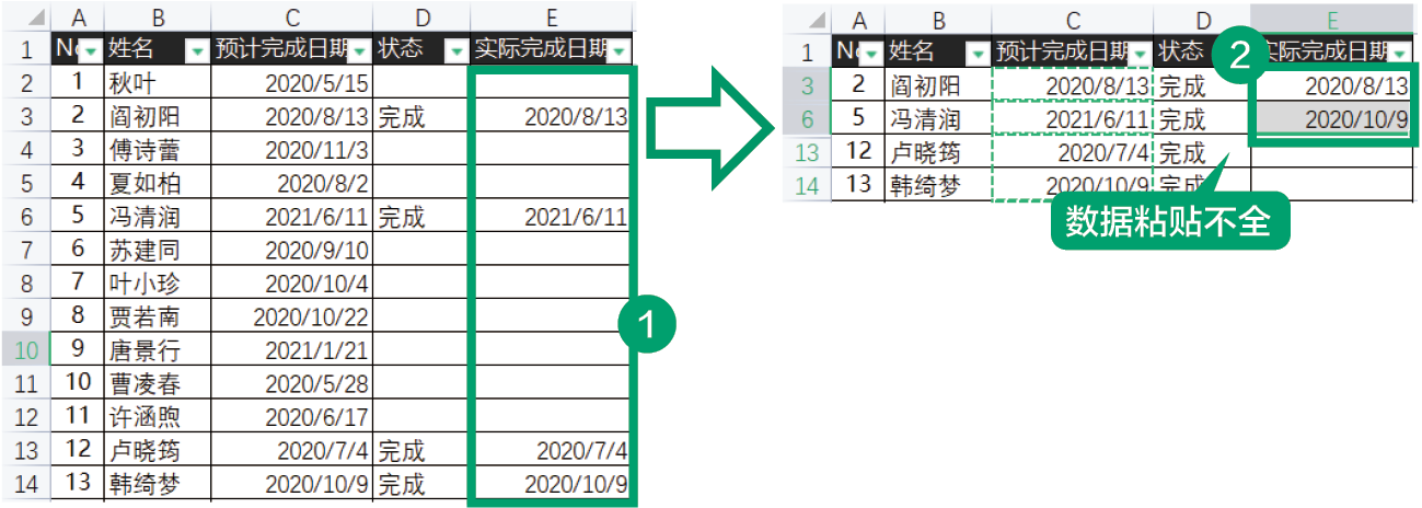 比如下页图所示的表格中,需要筛选出 “状态”为“完成”的数据,然后将“预计完成日期”列中的数据粘贴到“实际完成日期”列中。如果筛选后直接复制粘贴会出现数据粘贴不全的问题。