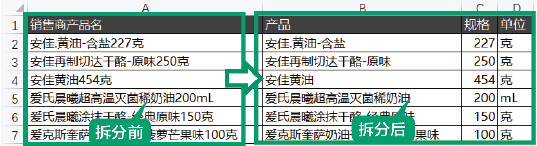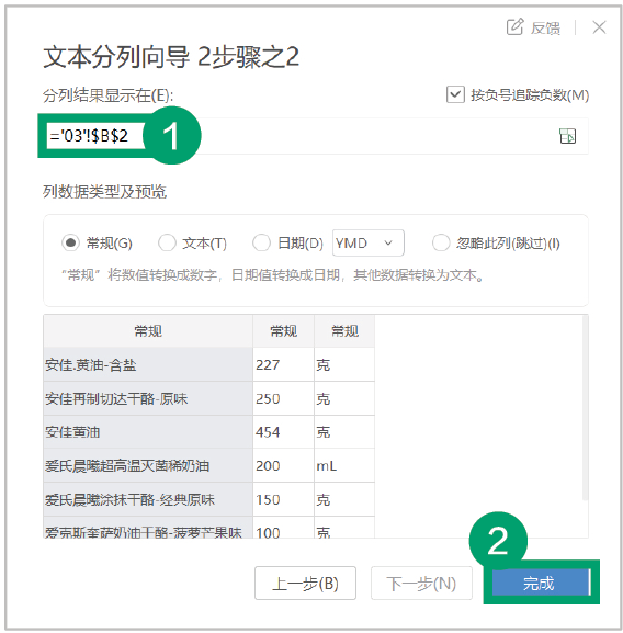 4 选择分列结果显示的位置,单击【完成】按钮,完成数据拆分。