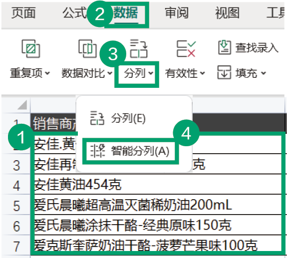 2 在【数据】选项卡中单击【分列】图标的下半部分,在弹出的菜单中选择【智能分列】命令,WPS表格会自动识别中文、数字和英文。