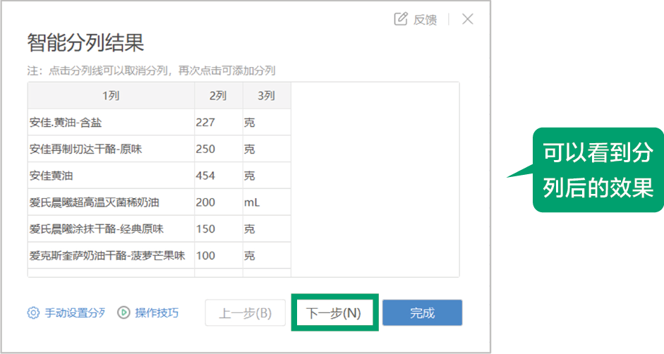 3 弹出【智能分列结果】对话框,单击【下一步】按钮。