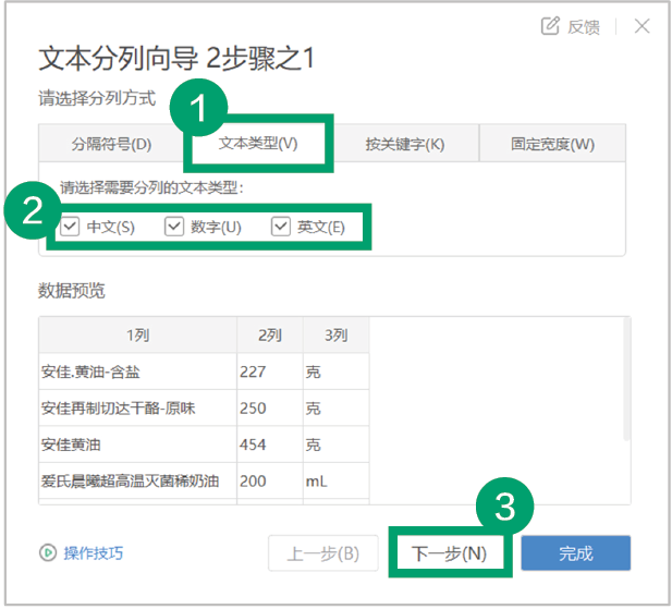 如果软件自动识别的分列位置不准确,可以在【智能分列结果】对话框中单击左下角的【手动设置分列】按钮进行设置。在弹出的分列向导对话框中选择【文本类型】选项卡,分别选择【中文】【数字】【英文】选项,单击【下一步】按钮,选择分列结果显示的位置,完成分列。
