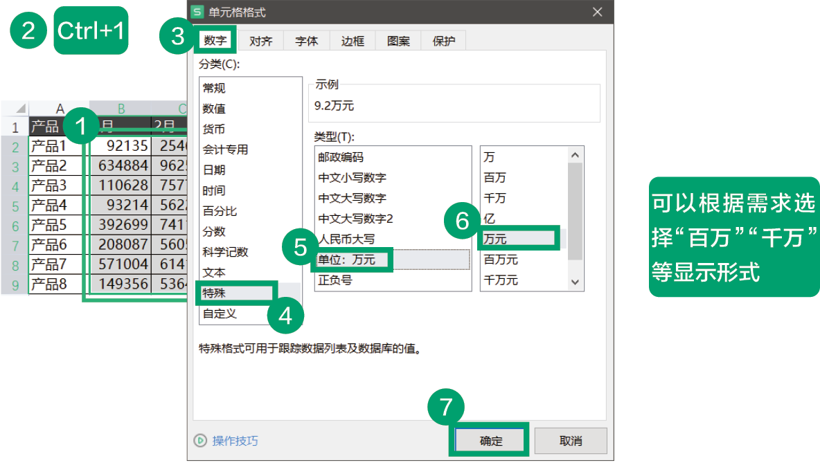 3 单击【数字】选项卡,选择【特殊】分类,设置【类型】为【单位:万元】→【万元】,单击【确定】按钮。