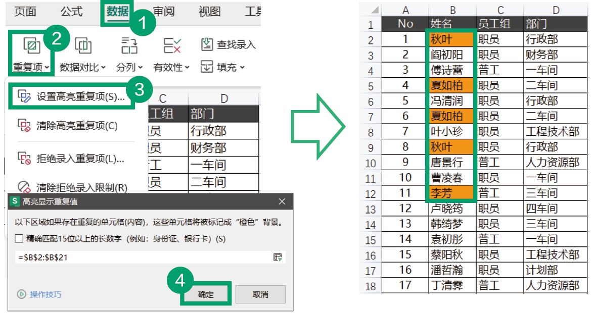 2 在【数据】选项卡中单击【重复项】图标,然后在弹出的菜单中选择【设置高亮重复项】命令,在弹出的对话框中单击【确定】按钮,有重复值的单元格就被高亮标记出来了。