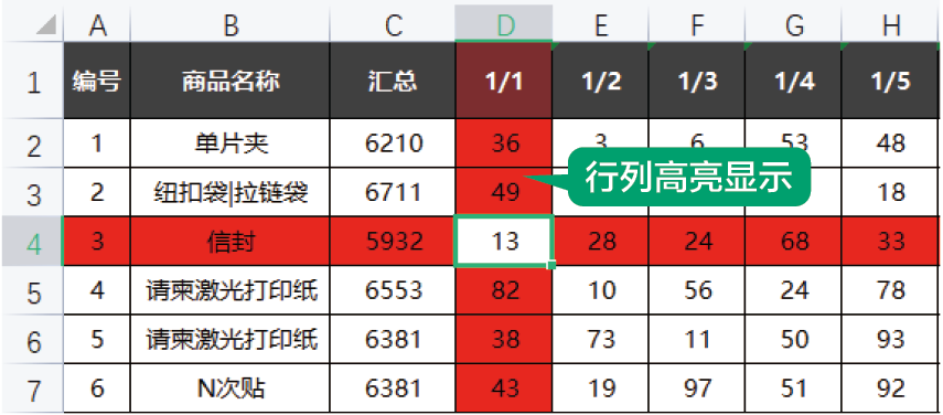 ,此时WPS表格会自动将单元格所在的行和列,使用红色突出标记出来。