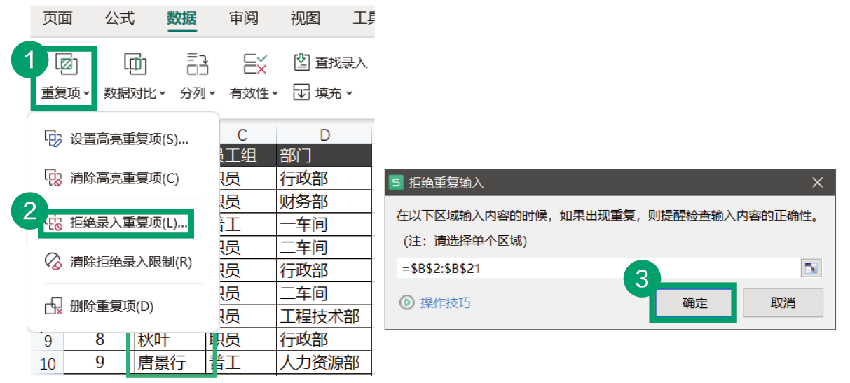 3 选择数据区域,单击【重复项】图标,选择【拒绝录入重复项】命令,在弹出的对话框中单击【确定】完成设置。