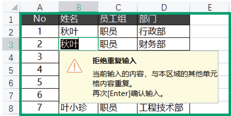 4 此时在单元格中尝试录入“秋叶”两次,WPS表格就会弹出对话框提示,这样就避免了重复项的录入。