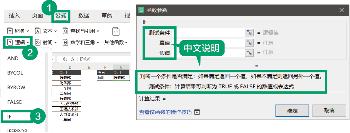 1 在【公式】选项卡中单击【逻辑】图标,在弹出的函数列表中单击IF函数,就可以在弹出的对话框中查看IF函数的参数说明。