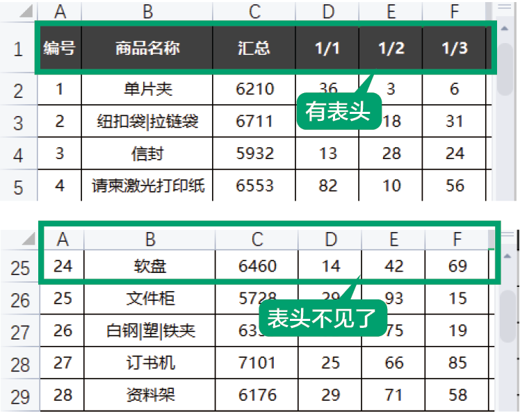 表格中的数据很多时,查看起来会非常不方便。比如下面的表格中,数据行特别多,向下浏览表格后,表头就看不见了。