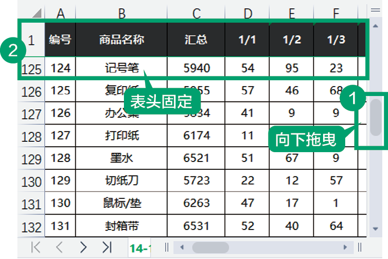 这时,向下浏览表格,可看到标题行被固定,不随表格滚动。