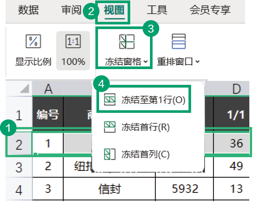 2 在【视图】选项卡中单击【冻结窗格】图标,在弹出的菜单中选择【冻结至第1行】命令,将第2行以上的数据固定。