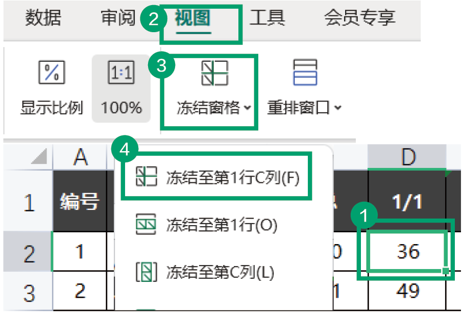 2 在【视图】选项卡中单击【冻结窗格】图标,在弹出的菜单中选择【冻结至第1行C列】命令。