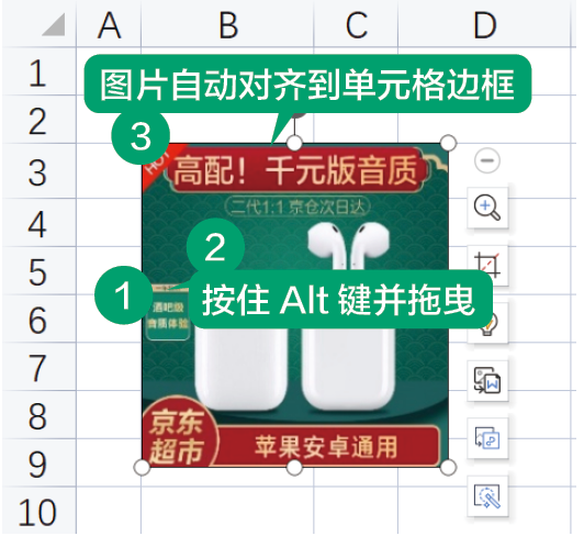 选择任意一张图片,按住Alt键并拖曳图片,图片会自动对齐到单元格边框。