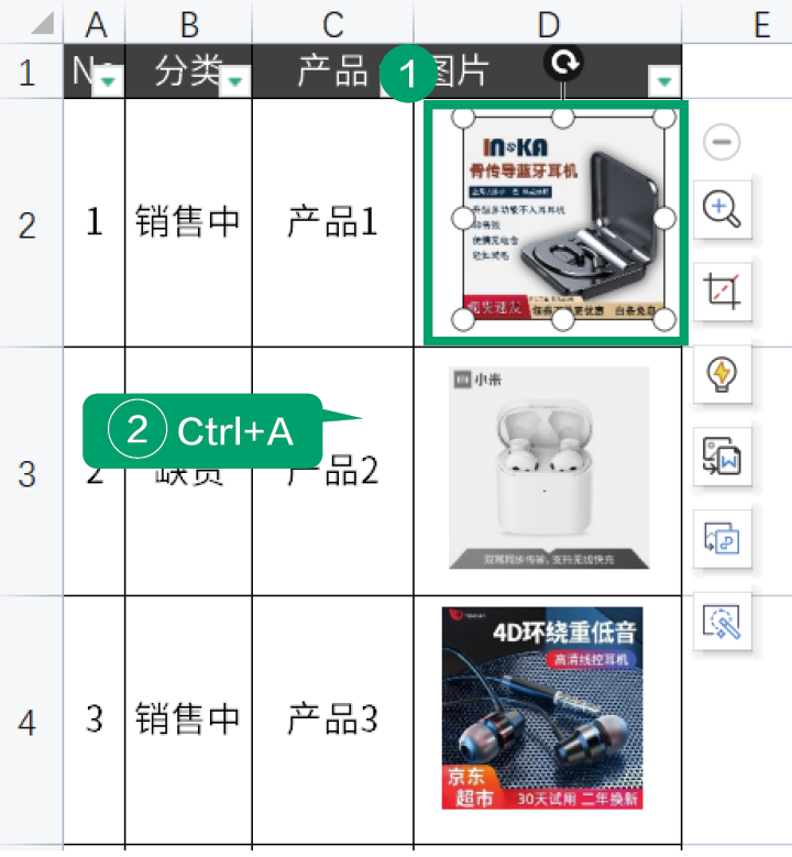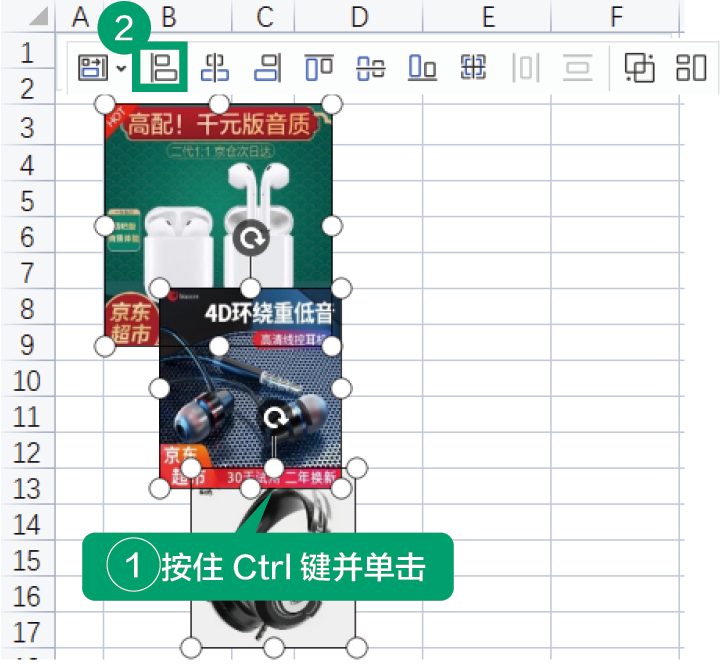 1 按住Ctrl键并单击需要对齐的图片,WPS表格会弹出一排悬浮按钮。