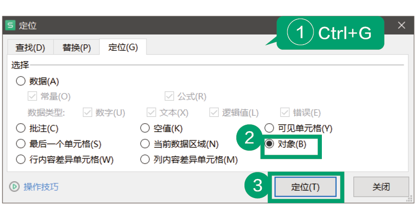 1 按快捷键Ctrl+G,弹出【定位】对话框,选择【对象】选项,单击【定位】按钮。