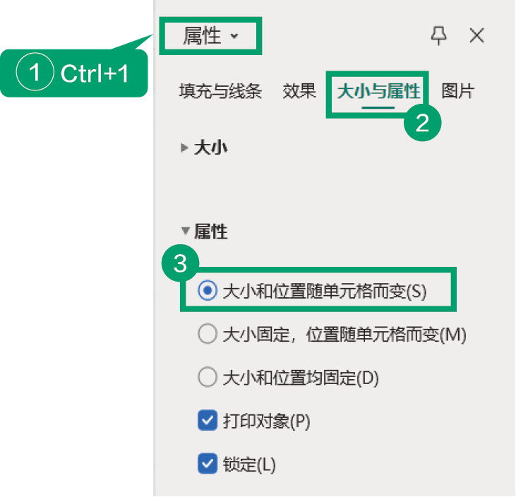3 单击【大小与属性】选项卡,在【属性】区域中选择【大小和位置随单元格而变】选项即可。