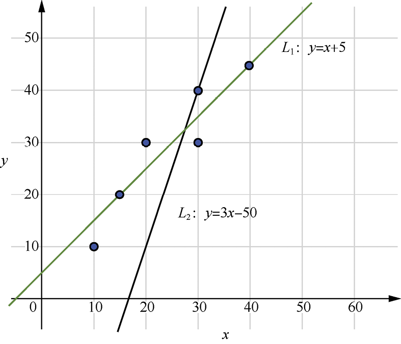在实例1.1中,假设求得的模型为y=x+5,数据点(10, 10)的误差为[10−(10+5)]2=25,数据点(15, 20)的误差为[20−(15+5)]2=0。