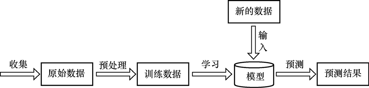 机器学习通常从收集数据开始(很多情况下数据是现成的),收集到的原始数据一般要经过预处理才能使用,比如删除重复数据、处理缺失值、去除无用特征等。根据数据和问题的特点选择算法,使用训练数据学习得到模型,该过程称为学习(learning)、训练(training)或拟合(fitting)。得到模型之后,可以对新的数据进行预测,得到预测结果。
