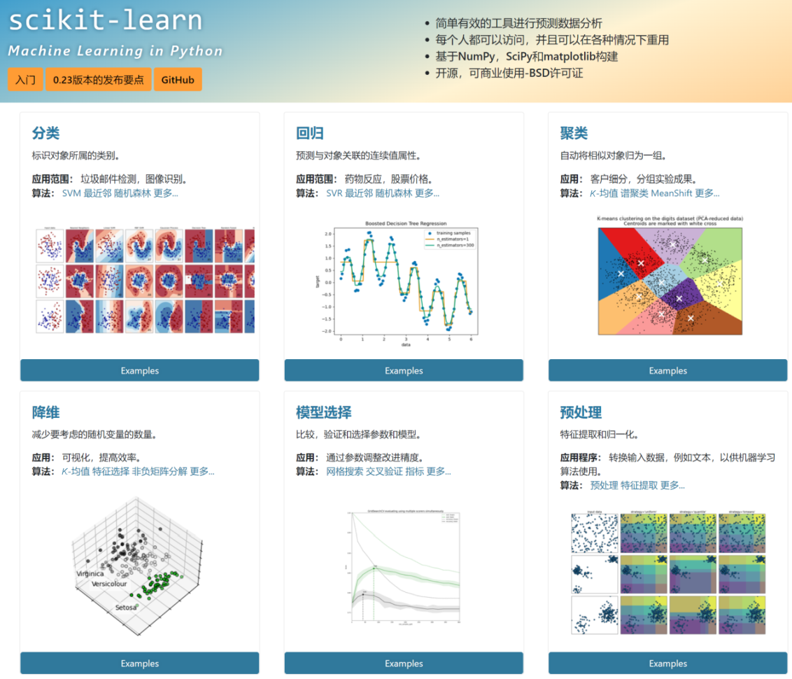 CDA数据科学研究院将scikit-learn文档翻译为中文,搭建了scikit-learn中文社区。图1-7为scikit-learn中文社区首页,scikit-learn包含六大模块,即分类、回归、聚类、降维、模型选择和预处理。scikit-learn的文档相当丰富,包括所有模型和算法的API使用说明,还有大量的算法原理介绍、示例代码、图形化展示等。
