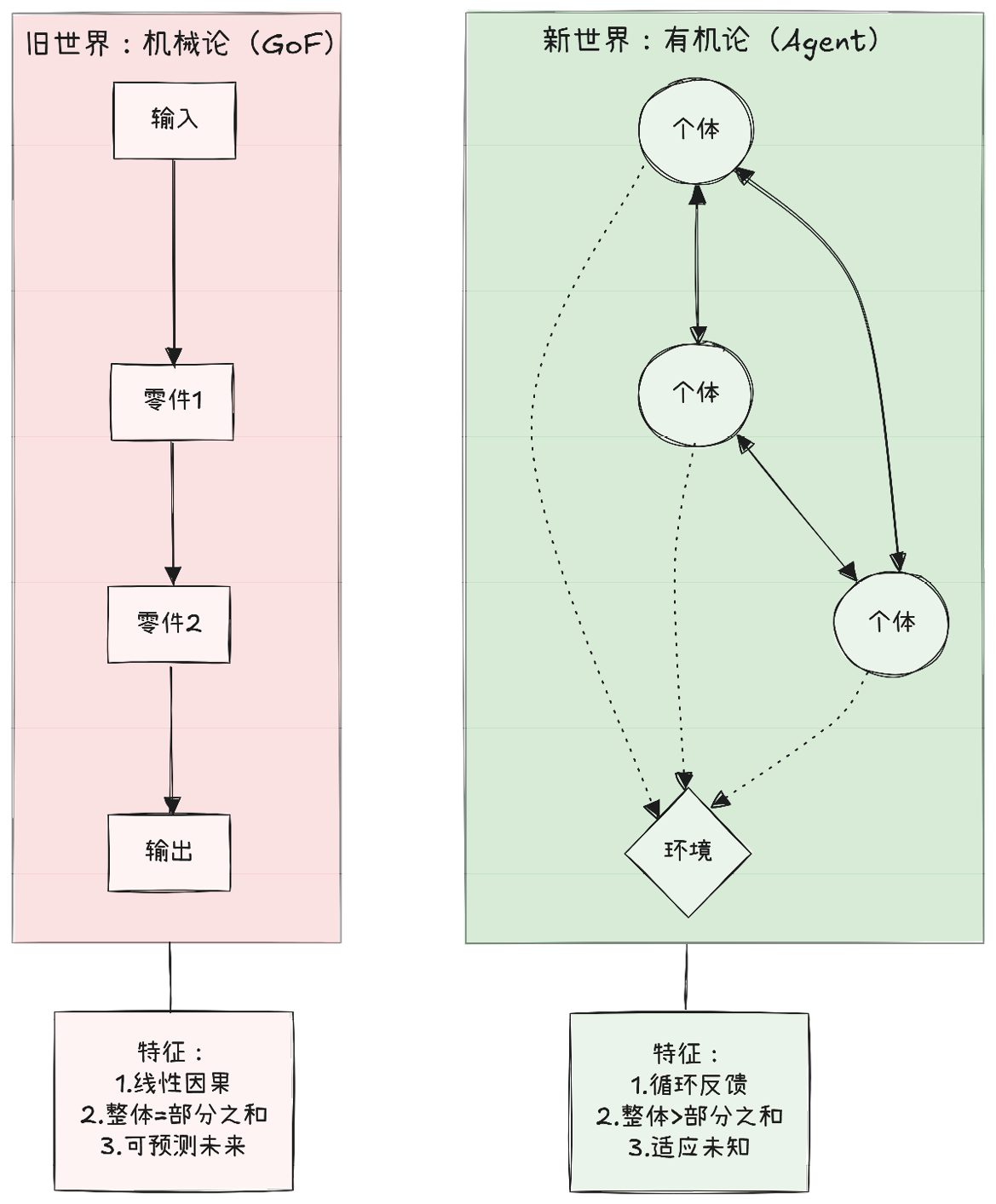 GoF的设计模式诞生于机械论世界观:系统是零件的组合,整体等于部分之和,因果关系是线性的,未来是可预测的。