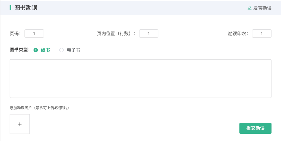 当您发现错误时,请登录异步社区(https://www.epubit.com),按书名搜索,进入本书页面,点击“发表勘误”,输入勘误信息,点击“提交勘误”按钮即可(见下图)。本书的作者和编辑会对您提交的勘误信息进行审核,确认并接受后,您将获赠异步社区的 100 积分。积分可用于在异步社区兑换优惠券、样书或奖品。