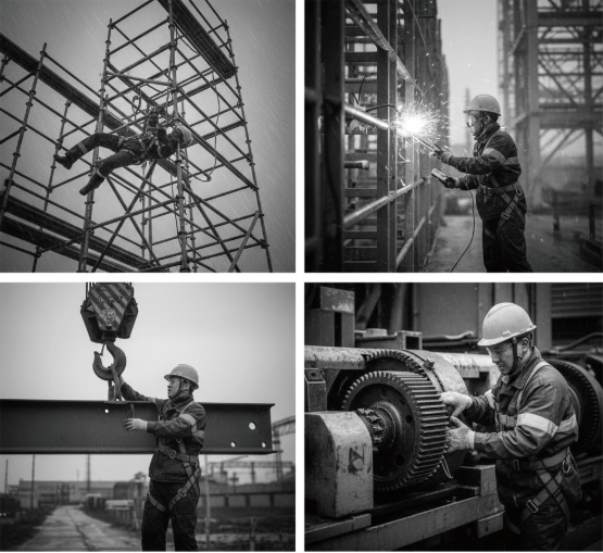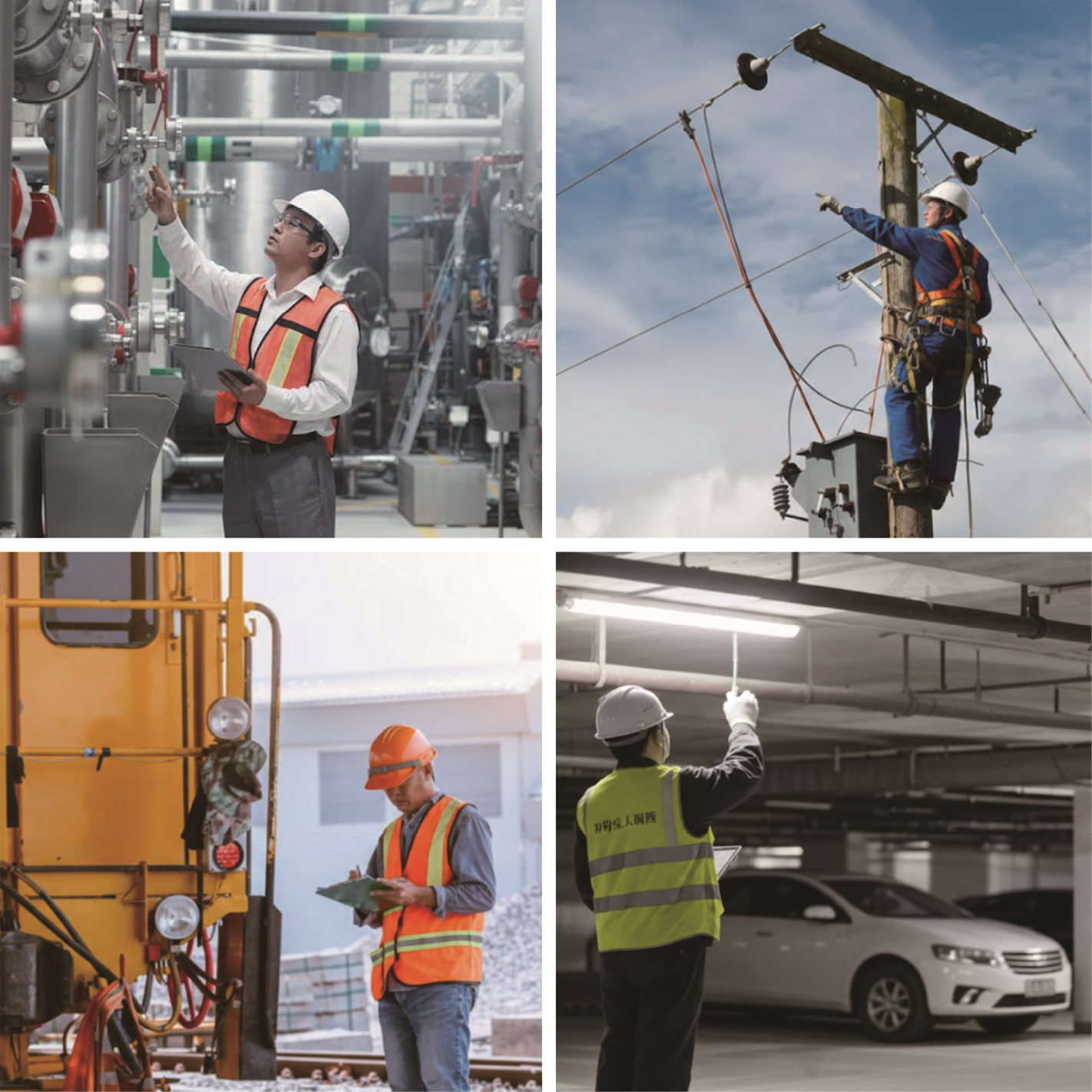 • 劳动强度大,依赖密集的人力投入。传统人工巡检覆盖广阔区域,需要巡检员长时间、长距离地步行或驾车,体能消耗巨大。对桥梁、高层建筑外墙、大型储罐、风力发电机叶片等进行检查时,需要人员进行高空攀爬、悬挂作业或在狭窄空间内移动,不仅辛苦,而且效率低下。如图1-1所示,巡检员分别对机器、输电线、铁路设施和地下室管道进行巡检。