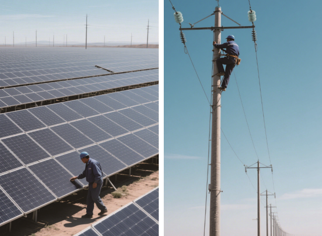 • 单人/单组效率受限,无法快速响应。传统人工巡检受物理速度限制,巡检员的移动速度、攀爬速度以及逐点进行详细检查的速度均有限,单位时间内能覆盖的检查点和区域相对较少。在需要对大量目标(如图1-2所示,左侧为数千块太阳能电池板的巡检,右侧为几百千米线路的巡检)进行快速普查时,传统人工巡检的效率瓶颈十分明显。