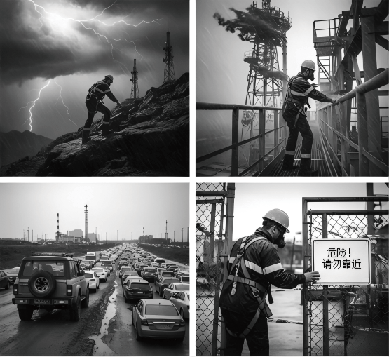 • 易受外部因素干扰,计划性差。恶劣天气往往会直接阻止或中断户外人工巡检,尤其是高空作业。地理障碍、交通拥堵、作业窗口限制等都会打乱巡检计划,延长整体时间。如图1-5所示,巡检员可能会碰到雷雨天气、陡峭山坡、交通堵塞和毒气泄漏等场景,这些情况给巡检工作造成了较大干扰。